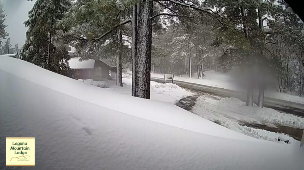 February 7, 2024 (San Diego’s East County)—Several inches or more of snow blanketed San Diego County’s mountains overnight.  Snow fell in Julian, Pine Valley, and many other mountain communities, with more precipitation forecast today.
