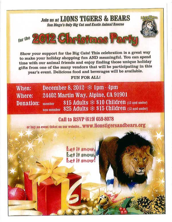 November 9, 2012 (Alpine) – Lions, Tigers & Bears is holding its 2012 Christmas Party on December 8 from 1 p.m. – 4 p.m. at 24402 Martin Way, Alpine. This celebration is a great way to show your support for the Big Cats by spending some time with them and finding unique holiday gifts from among the many vendors participating. Delicious food and beverages will be available.
