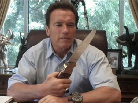 July 22, 2009 (San Diego’s East County)–Governor Arnold Schwarzenegger posted a knife-wielding video to exemplify his willingness to sign a budget with deep cuts to services for Californians. The latest budget, negotiated by legislative leaders in both parties, proposes to close the $24 billion budget gap in part by forcing cities and counties to loan the state money for three years, with interest. “It would raid municipal funds for $1.9 billion, mostly county money,” the L.A. Times reports. Cities and counties would lose another billion dollars in transportation money and redevelopment agencies would be ordered to pony up an additional $1.7 billion.
