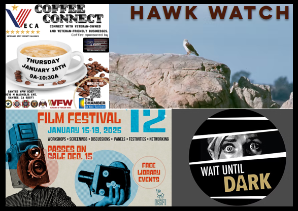 By Jonathan Goetz January 9, 2024 (El Cajon) – January happenings include a film festival in Borrego Springs—ideal if you like the desert without the heat—as well as opportunities to see raptors up close in Ramona, take a group hike up Cowles Mountain, watch a thriller at Lamplighters Theatre in La Mesa, or network with […]