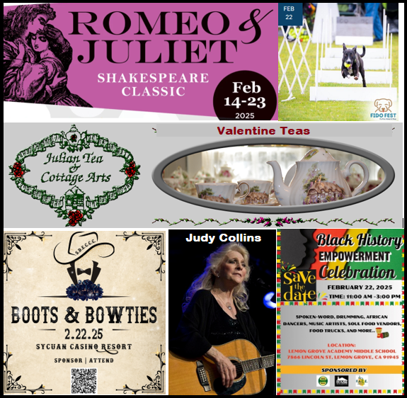 By Miriam Raftery February 2, 2025 (San Diego’s East County) – February brings some favorite festivities and fun-filled events including a Judy Collins Concert in El Cajon, a stage production of Romeo and Juliet in Borrego Spr9ings, romantic Valentine’s teas in Julian, a black history celebration in Lemon Grove, the Boots and Bowties awards dinner […]