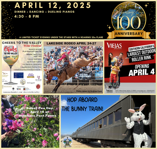 March 18, 2025 (San Diego’s East County) – It’s springtime in East County—the season for flower festivals, Easter egg hunts, Lakeside’s rodeo and Western Days Parade, outdoor roller skating at Viejas , an aerobatics competition in Borrego Springs, and bunny rides aboard a historic train in Campo. This April, you can also enjoy a roaring […]