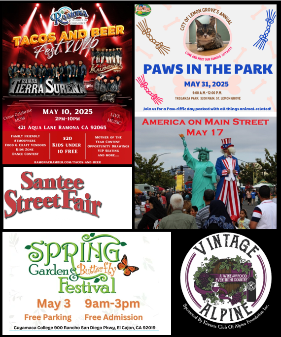 By Miriam Raftery April 15, 2025 (San Diego’s East County) – The merry month of May brings many special events including a trio of events at Cuyamaca College including the Coyote Music Festival, the Spring Garden and Butterfly Festival, and a museum Arts and Crafts Fair. Food, wine and beer lovers can savor Vintage Alpine, […]