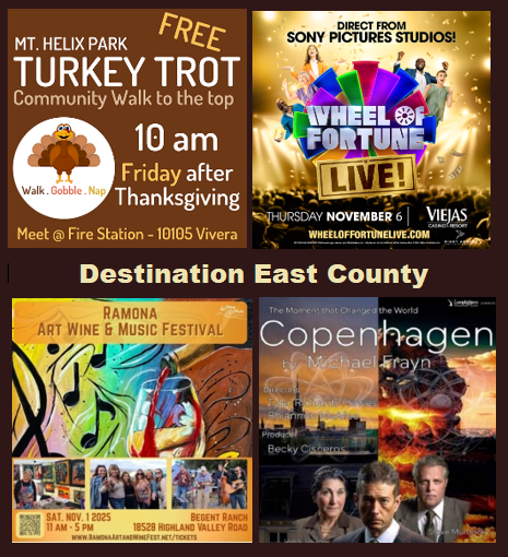 October 18, 2025 (San Diego’s East County) – November brings numerous noteworthy events to East County, including the Ramona Art and Wine Festival, an Antique and Craft Fair at Summers Past Farms in Flinn Springs, the Wheel of Fortune live game show at Viejas in Alpine, the award-winning play Copenhagen at Lamplighters Theatre in La […]