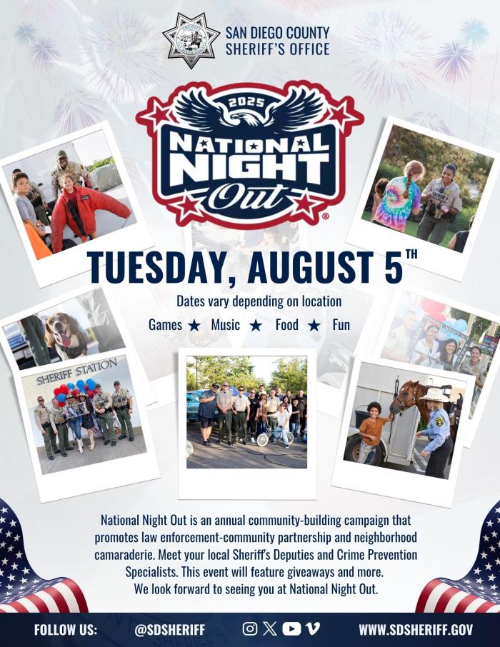 East County News Service August 1, 2025 (San Diego) – Sheriff’s stations and substations across the county will be hosting family-friendly community events to take a stand against crime on Tuesday, August 5. National Night Out is an annual event that promotes law enforcement-community partnership and neighborhood camaraderie. Meet your local Sheriff’s Deputies and receive public […]