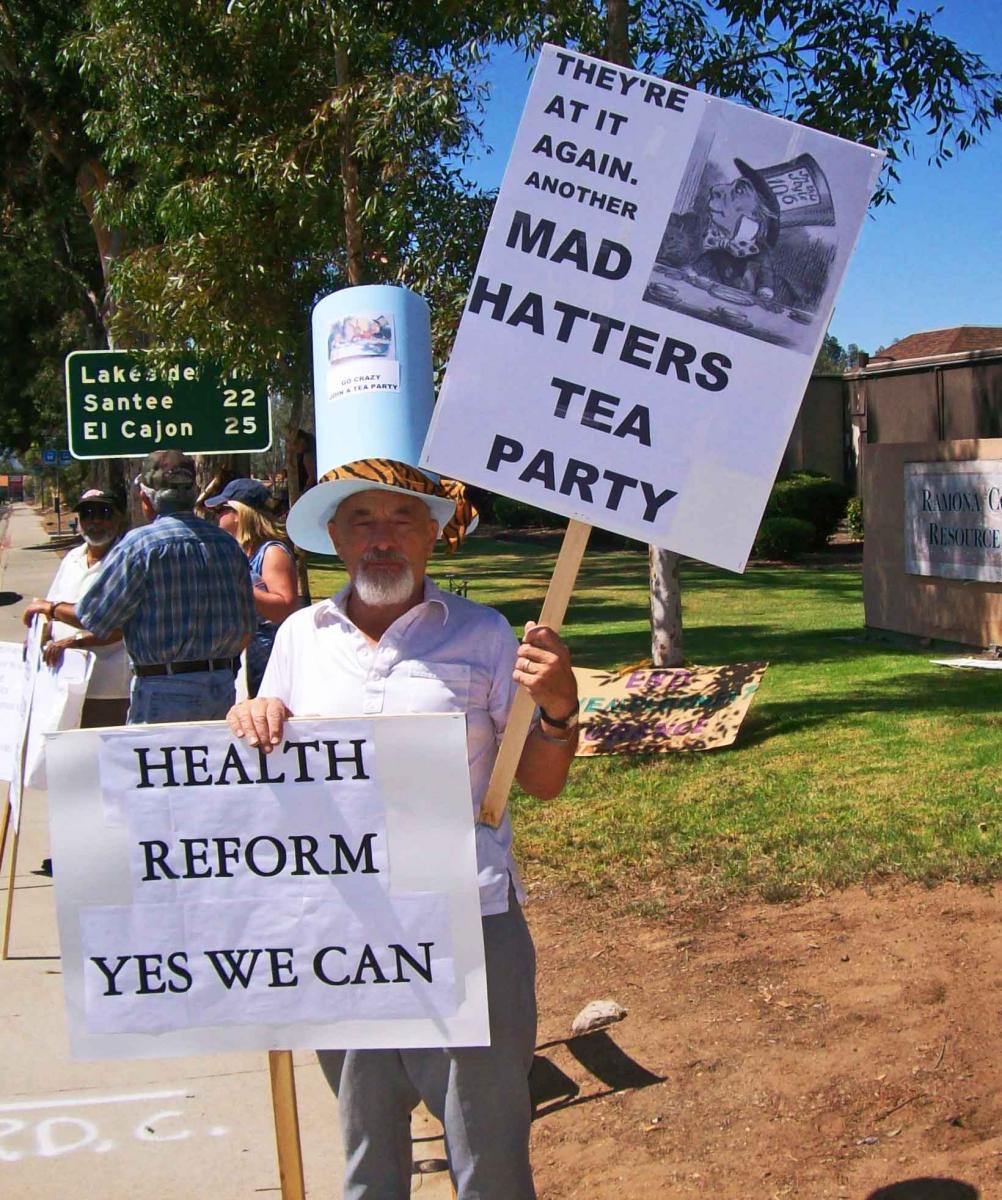 In Ramona, liberals from the Ramona Forum (www.ramonaforum.com) staged a “Mad Hatter Tea Party” counter-protest across the street from a T.E.A. party event to “demonstrate the hypocrisy of the Tea Party gang,” said Dave Patterson.