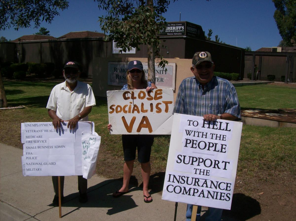 The group played the song “We don’t need no education” on a CD player, carried facetious signs, and urged passersby to sign a petition to end socialism. “It was a pledge to end welfare, medical, emergency room use by the uninsured and illegal aliens, Medicare, Social Security, VA, police, library and many more [government services] including CalTrans,” Patterson told East County Magazine in an e-mail. “Needless to say, we didn’t have one signer!”