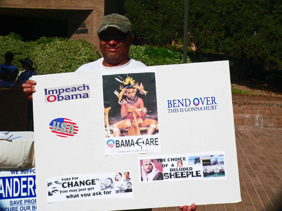 But there was a dark side to the rallies, with some T.E.A. Party protesters carrying signs with racist messages or images, profanity, and veiled threats. In El Cajon, one sign depicted Obama as an African tribesman with a message reading “Bend Over, This is Gonna Hurt”; another sign read “F**k Obama with a red X across the President’s face.