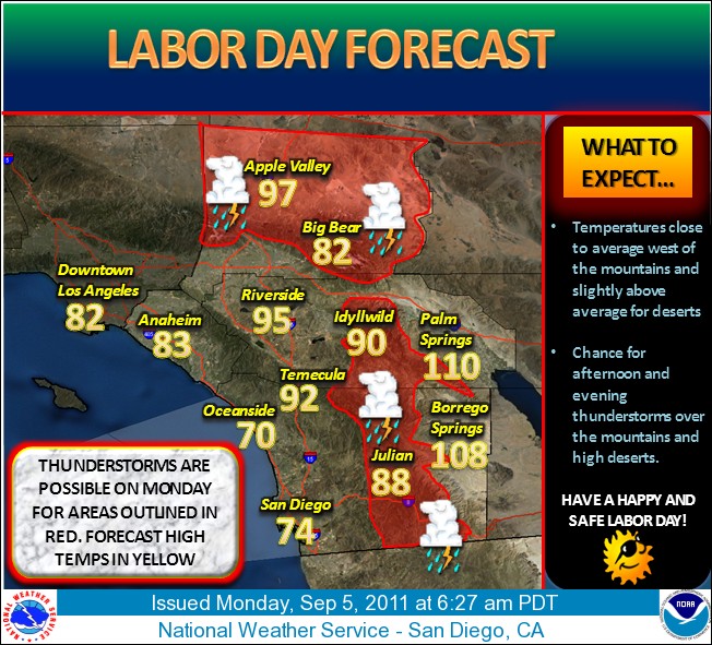 September 5, 2011 (San Diego) – Before you fire up that Labor Day barbecue, you’d better check the weather. The National Weather Service has predicted a chance of thunderstorms for San Diego’s mountains and deserts this afternoon and evening; thunder can be heard over portions of East County this afternoon. Muggy weather is due to monsoonal moisture from the southeast.