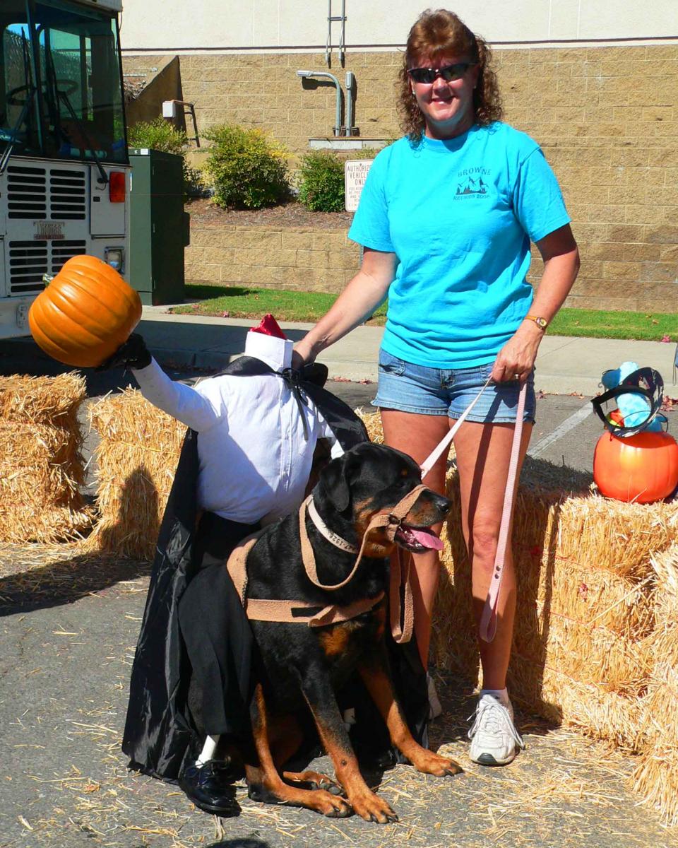 October 28, 2009 (El Cajon) – Moe, a Rottweiler disguised as the headless horseman, was named top dog at the El Cajon Animal Shelter’s annual pet costume contest—taking home a basketful of dog toys and treats. “I made his costume,” said Moe’s owner, Ann McCorkell of El Cajon.