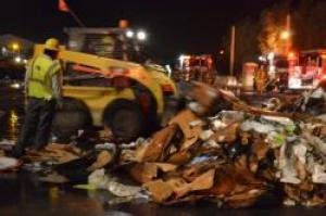 “At first, employees of Waste Management were operating the skip-loaders, but the smoke became too thick inside the facility,” Monica Zech, City of El Cajon spokesperson, reports. “It was decided firefighters, wearing their BA’s (mask and breathing apparatus) would take over operating the skip loaders. This removal process is expected to last several hours. San Diego Fire & Rescue’s Hazmat Team is over-seeing this operation, evaluating the materials and the run off for any hazardous materials.”