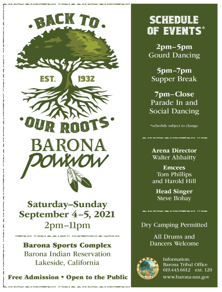 Printer-friendly version By Miriam Raftery September 4, 2021 (Lakeside) – Since 1932, the Barona Powwow has been an event for Native American tribal members to gather. The pandemic cancelled last