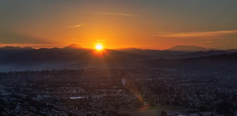 Printer-friendly version By Miriam Raftery Photo, left: Sunrise seen from the ancient Kumeyaay observatory on Cowles Mountain. The larger mountain to the left of the sun is Lyons Peak.
