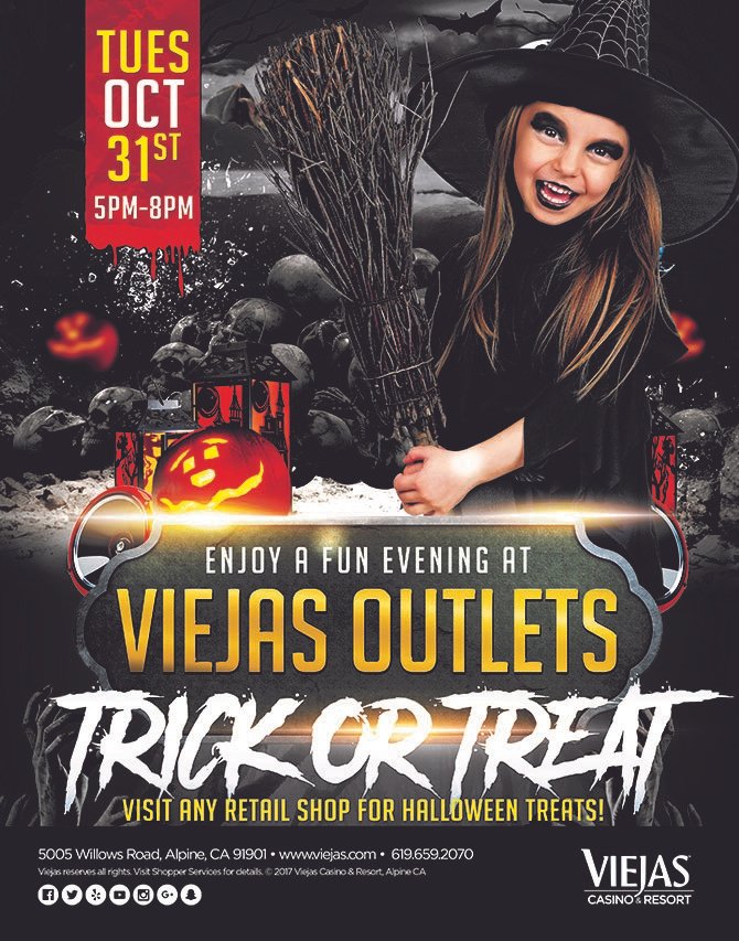 Printer-friendly version East County News Service October 25, 2017 (Alpine) – Viejas Outlets in Alpine invite you to “trick or treat off the street” on Tuesday, October 31st from