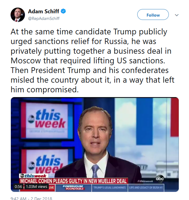 Schiff recently tweeted, “At the same time candidate Trump publicly urged sanctions relief for Russia, he was privately putting together a business deal in Moscow that required lifting US sanctions. Then President Trump and his confederates misled the country about it, in a way that left him compromised.”