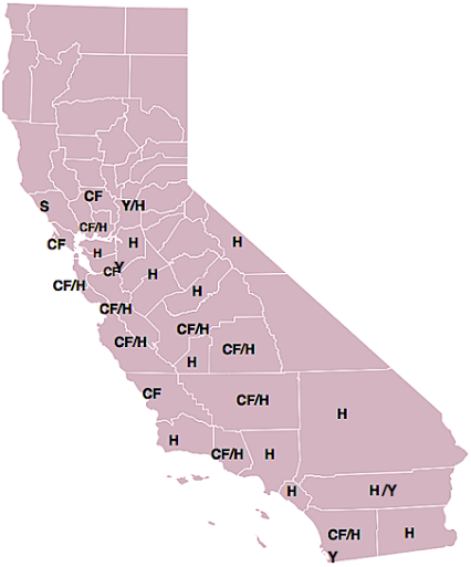 Spread of PACE programs. Symbol placings are not all county-specific. CF = California First; H = Hero PACE; S = Sonoma; Y= Ygrene
