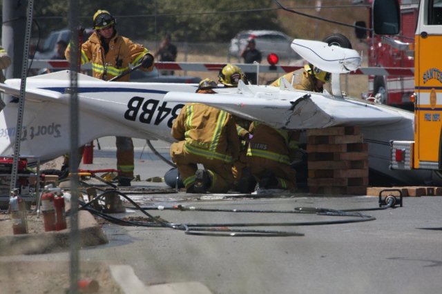 The plane had taken off from Gillespie Field when the pilot experience mechanical problems and turned back. The plane clipped trolley lines, crashing upside down onto a roadway. Rescue workers had to wait for trolley lines to be deenergized before rescuing the pilot and sole occupant, who complained of numbness in his arm and was transported to a local hospital for treatment.