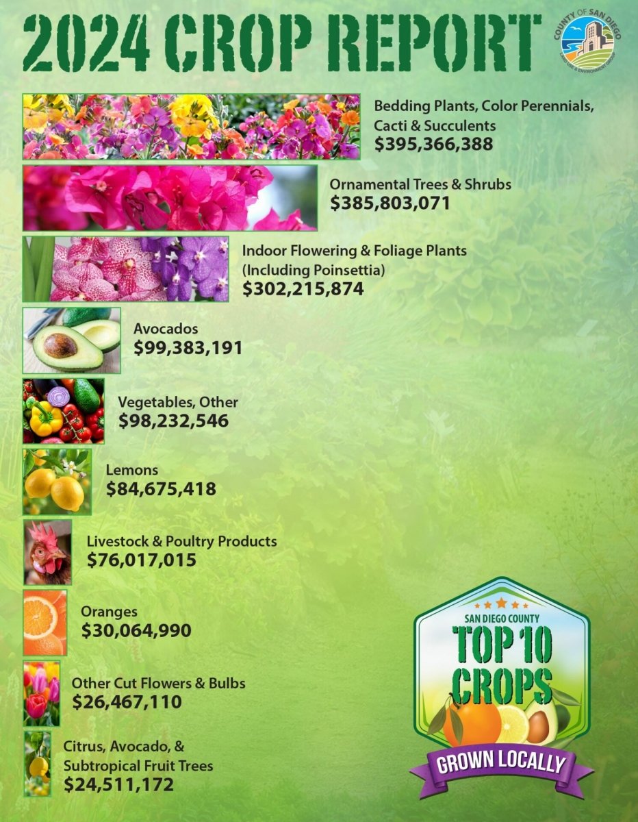 The new Crop Report, which covers the 2024 growing season, showed the county’s list of Top 10 crops changed slightly from the previous year, with “Vegetables, Other” jumping over lemons into fifth place, just behind avocados.