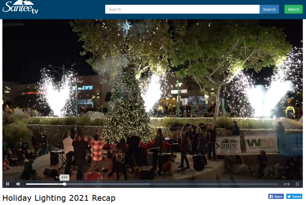 December 10, 2021 (Santee) – The new Santee TV station now has a video posted of the city’s tree-lighting ceremony, which included many other activities such as snow sledding and live music. View the Santee Tree Lighting recap video at: https://reflect-cityofsantee.cablecast.tv/CablecastPublicSite/show/210?channel=1