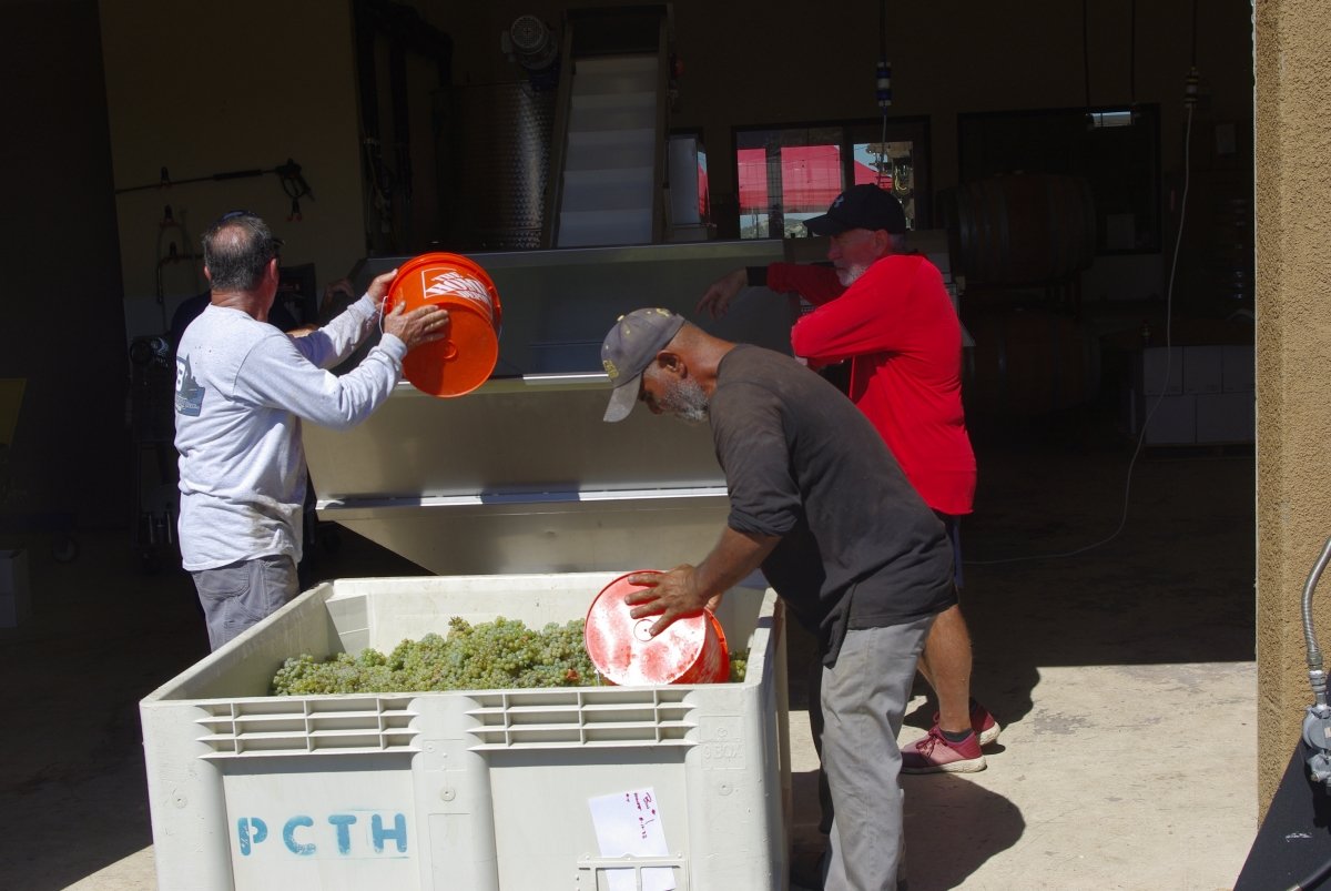 Step 1-Picking the Grapes. Picking grapes does get sticky, but tolerable. Each side of each row had folks cutting the clusters. Netting had been in place to discourage birds from feasting on tasty treats. Fifteen rows were picked on both sides; we ended about 8:30 a.m.