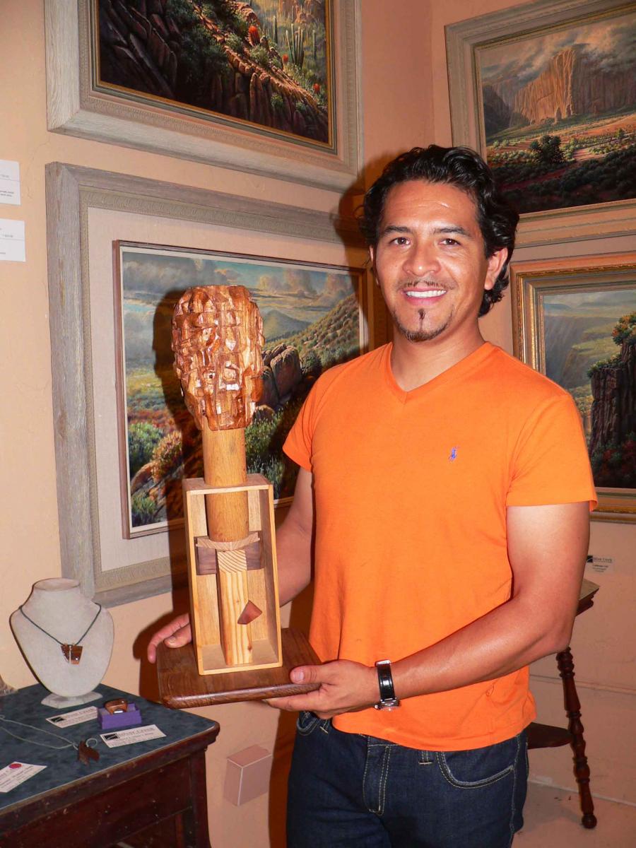 Silver Creek Fine Art & Custom Framing offered samplings of Navarre Correas and Silvercreek wines, which were pleasing though not locally grown, along with a tempting array of appetizers. The real treat here, however, is the artwork including paintings, sculptures and jewelry by talented East County artists. Carlos Castrejon is best known for his intricate Western bronze sculptures such as “A Signal”, which depicts a Blackfoot warrior and took 50 to 60 hours to create. But he recently crafted wooden jewelry an abstract carving titled Mascaras using monkeywood from the Philippines. “I wanted to capture in one sculpture the many different expressions a human goes through in a day,” he said of the latter (photo, left).