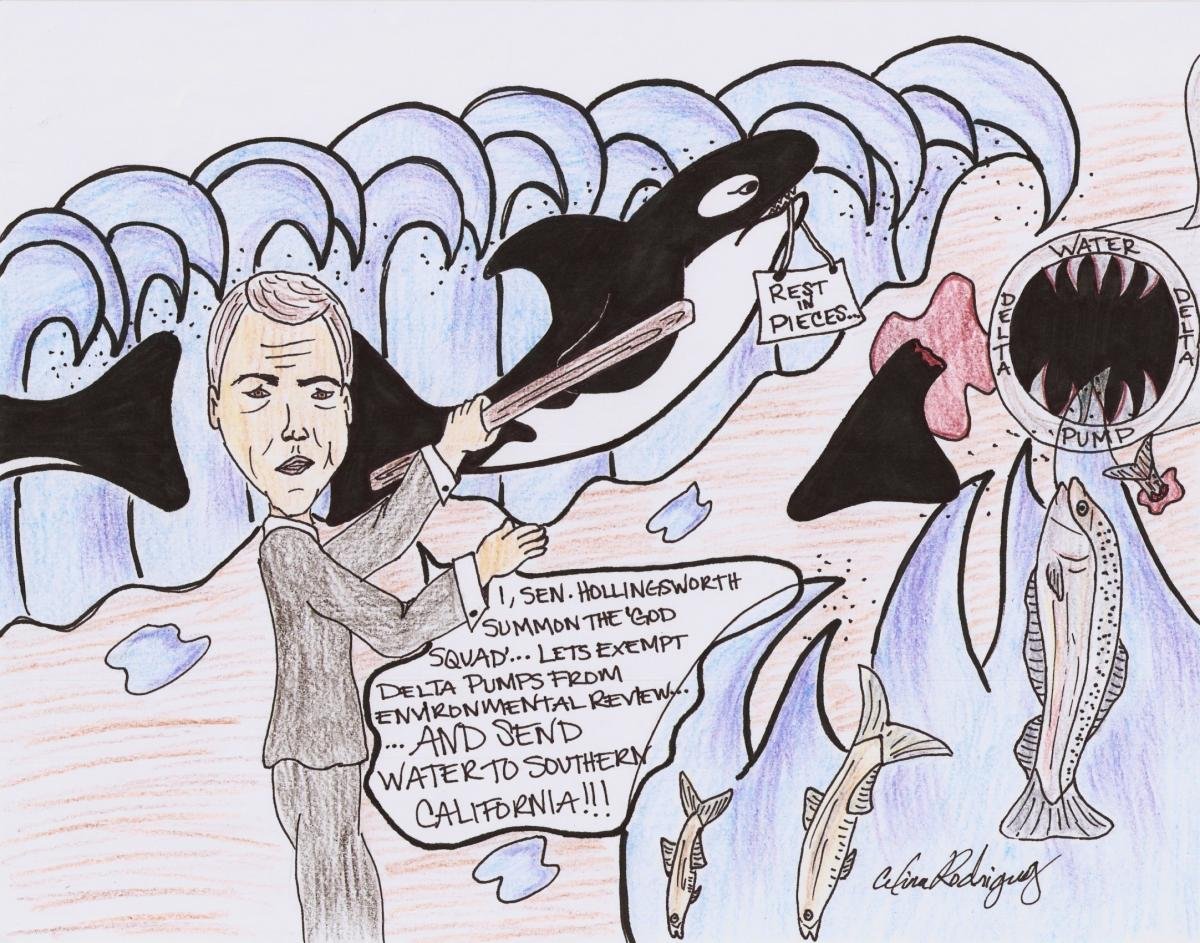 There’s more than smelt at stake, however. Recordnet.com, a San Joaquin online newspaper, reported on June 5 that “federal scientists officially determined Thursday that California’s vast network of dams, canals and pumps threatens the survival of salmon, steelhead, green sturgeon and even a small population of killer whales…The National Marine Fisheries Service set in place a series of strategies to stabilize the crashing species, including water supply reductions and passage for migratory fish over Shasta and Folsom dams to historic spawning grounds. Also, the feds want more water flowing down the Stanislaus River during the springtime, which would sizable dent Stockton’s water supply.” (cartoon by Celina Rodriguez)