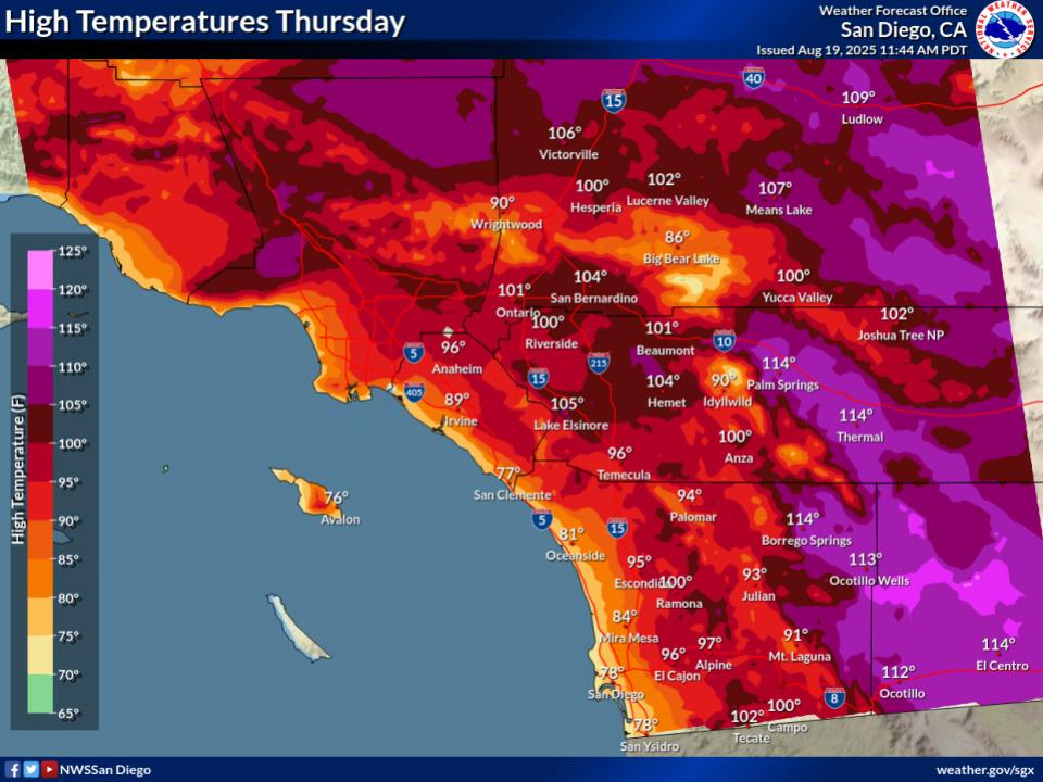 By Miriam Raftery August 6, 2025 (San Diego’s East County) – Dangerously high temperatures are forecast across much of East County through Friday, peaking on Thursday. Other East County