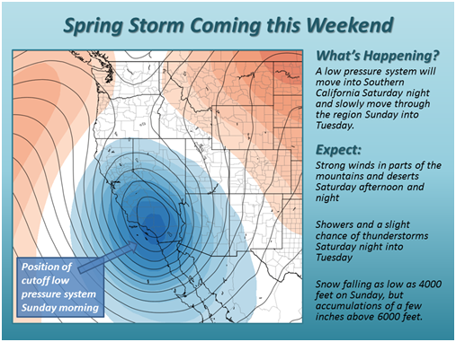 By Miriam Raftery May 4, 2017 (San Diego’s East County) – A late spring storm will bring gusty winds, rain and snow as low as 4000 feet this weekend,