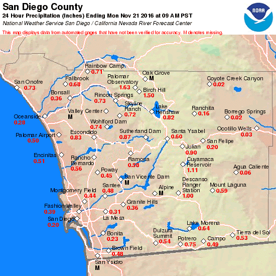 East County News Service November 21, 2016 (San Diego’s East County) — Sunday night’s storm brought heavy rains to much of drought-stricken San Diego County. Descanso and Cuyamaca received
