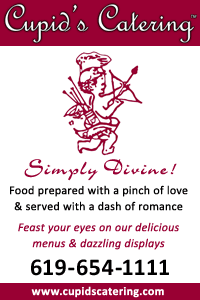 Cupid’s Catering: Owner Gloria Bautisa prepares creations with a pinch of love served up with a dash of romance—from chocolate fountains to fruit peacocks, your appetite will be whetted for more. 1473 Hidden Mesa Trail, El Cajon, CA 92109; (619)654-1111; www.cupidscatering.com.
