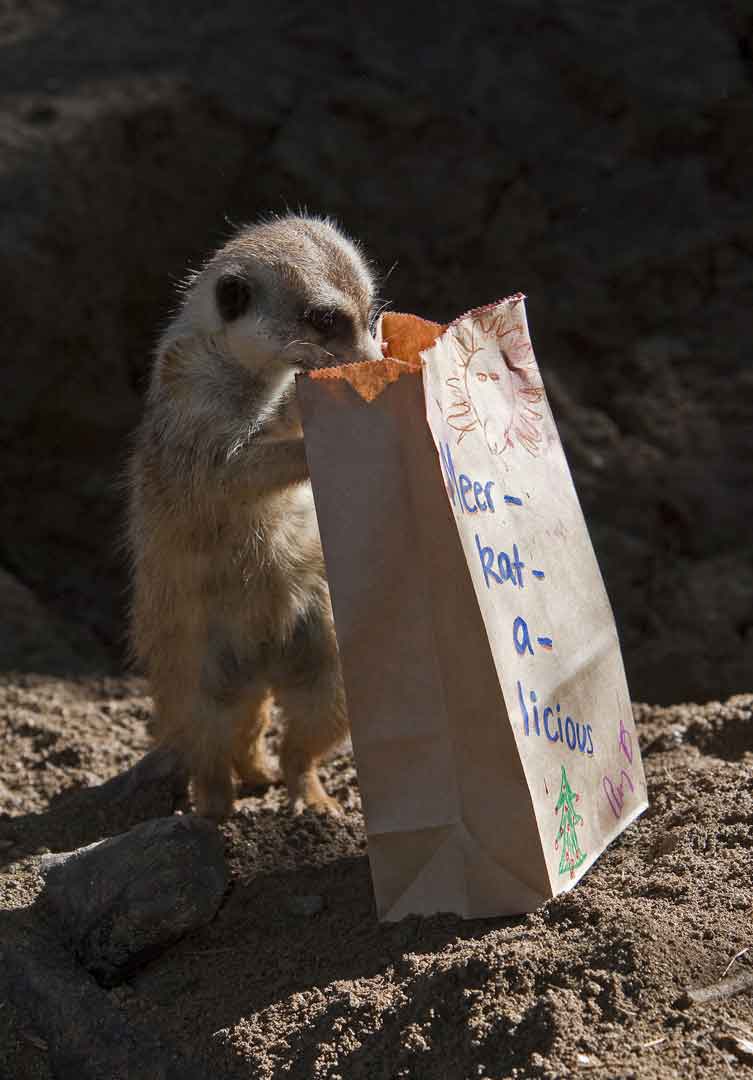 On Friday, the meerkat enclosure was a frenzy of excitement as pint-sized entertainers discovered bags full of treats hand-painted by Wild Animal Park visitors. One dived into a bag with “I HEART meerkats” written on the front. Other meerkats pounced on holiday decorated bags filled with popcorn, sunflower seeds and pomegranate seeds.