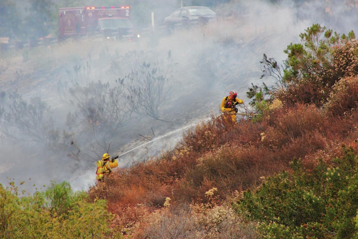 July 12, 2012 (Lakeside) – A brush fire briefly threatened homes at I-8 and Los Coches Road near in Lakeside early this afternoon. Thanks to a full wildland fire response, the blaze was extinguished in about 20 minutes.