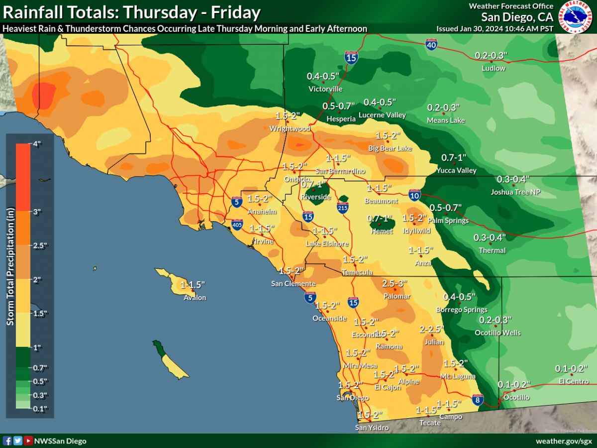 Printer-friendly versionBy Miriam Raftery January 31, 2024 (San Diego)—On the heels of last week’s severe storm, another atmospheric river is moving into our region, bringing widespread rain, mountain snow as