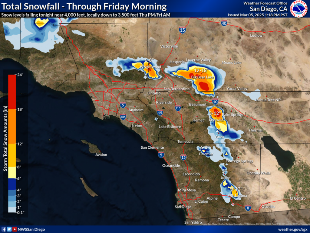 March 5, 2025 (San Diego’s East County) – A major storm system will bring strong winds and rain across our region, with heavy snow forecast starting tonight in East County mountains. Mount Laguna could receive up to a foot of snow, with up to eight inches on Palomar Mountain and three inches in Julian by Friday morning. Heavy snow will make it difficult to travel above 4,000 feet in elevation.