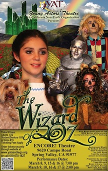 March 4, 2013 (Spring Valley) – Click your ruby slilppers and make a wish: Young Actors Theatre will present the Wizard of Oz on March 8-10 and March 15-17 at the Encore! Theater, 9620 Campo Road in Spring Valley.
