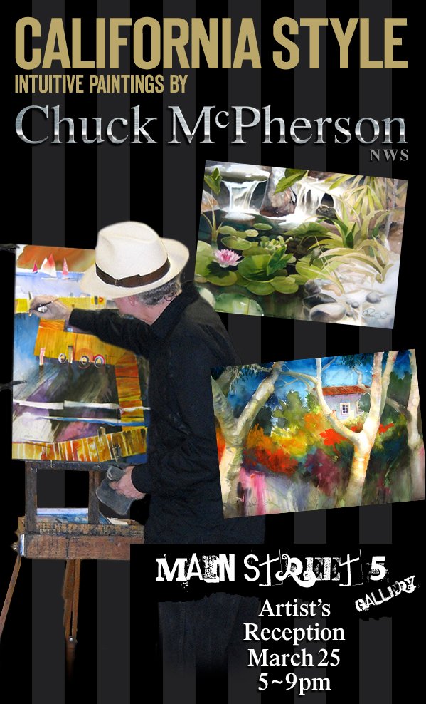 March 23, 2011 (El Cajon) — Main Street 5 Gallery (www.mainstreet5gallery.com) is presenting a solo show by award-winning watercolorist Chuck McPherson. The opening reception will take place on Friday, March 25 from 5 to 9 p.m., when you can come meet the artist, see some of his artwork and enjoy refreshments in a fun, lively atmosphere.