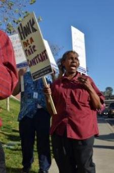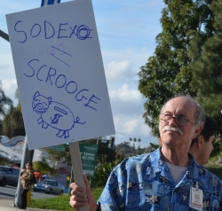 December 13, 2012 (La Mesa) Housekeeping and dietary workers were once again outside Grossmont Hospital walking the sidewalk yesterday.  The employees work for Sodexo, a subcontractor whose workers are paid less than Sharp Hospital employees but are charged more for their healthcare, say union representatives who seek fairer wage and benefit terms for Sodexo workers.