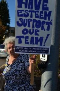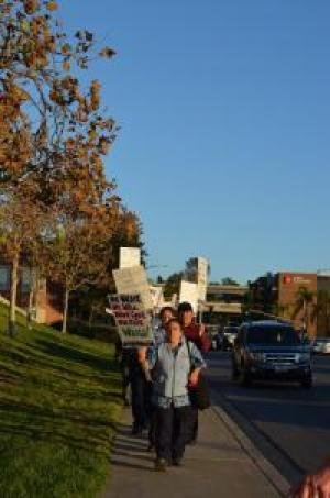 November 20, 2012 (La Mesa)—Some workers arrived after their shifts ended; others came from home to join a march yesterday afternoon outside Grossmont Hospital. All were determined to draw public attention to their efforts to gain better working conditions and compensation.