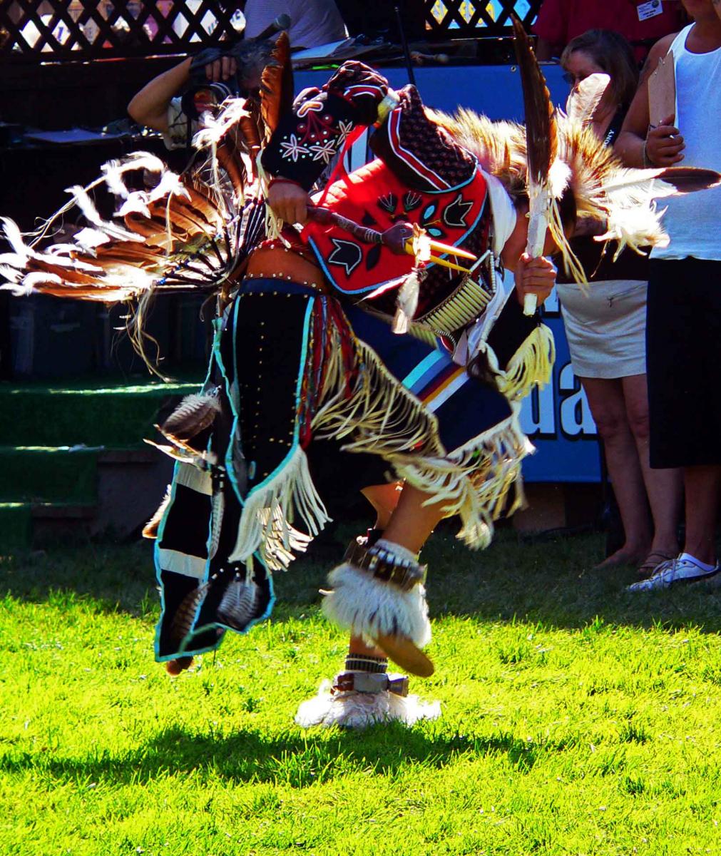 Each dance reflects a specific purpose; for example, grass dancing originated as a means of stamping down grasses to create a flat area for pow-wow grounds. Dancers wore braided sweetgrass. Men’s traditional dance originated when warriors would return home and reenact higlights of battles festooned in quills, beads, and a bustle of eagle feathers (photo).