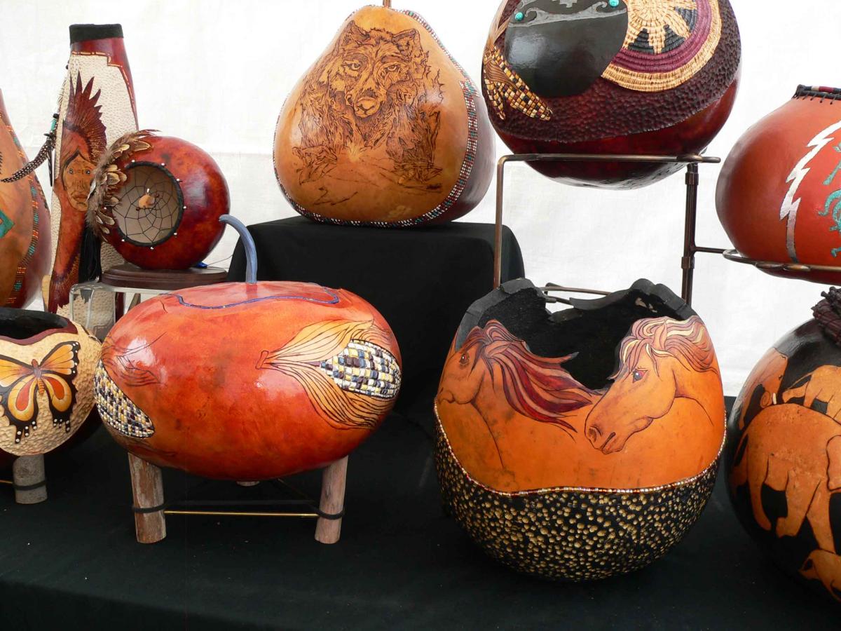Native American jewelry and handicrafts, such as carved gourds (photo) and Indian flutes, will be offered by vendors at the pow-wows. Foods and beverages can also be purchased, including Native American fare such as Indian fry bread.