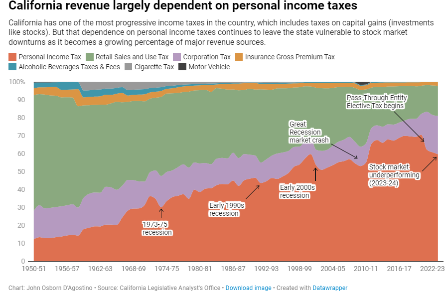 In early December, the fallout from that delayed accounting became clear: The state is on pace to have a budget deficit of $68 billion in 2024-25, the Legislative Analyst’s Office reported. About $26 billion of that is from the deficit that is emerging on the books for the 2022-23 year. Basically, because the state didn’t have all its tax revenue tallied by the time lawmakers passed the 2023-24 budget in June, they didn’t know that 2022-23 would have a massive budget hole. Now the state has to fill that fiscal chasm from last year as another collapse in revenues relative to spending plans materializes in the current fiscal year.