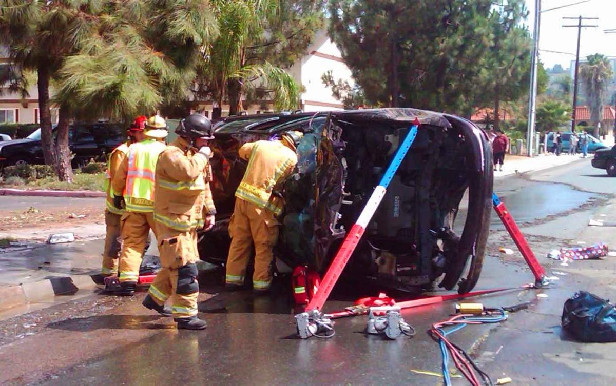 Bystanders rescued an 84-year-old man from this vehicle. The driver had struck a fire hydrant and became trapped with his head underwater beneath the flow. The good samaritans flipped the vehicle onto its side, enabling the man to breathe. El Cajon and La Mesa fire and rescue personnel later used jaws of life to free the man, who was taken to a nearby hospital and treated for trauma.