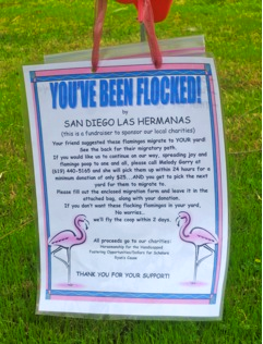 December 1, 2009 – – If you’ve wondered what’s up with those pink flamingo flocks you’ve been seeing around East County, wonder no more. In a clever response to charity fundraising in a down economy, San Diego La Hermanas is stealth-flocking people’s yards.